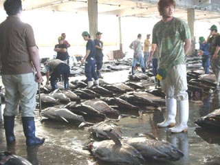 朝8時頃、こんな風にマグロが並べられ、競り落とされていきます。